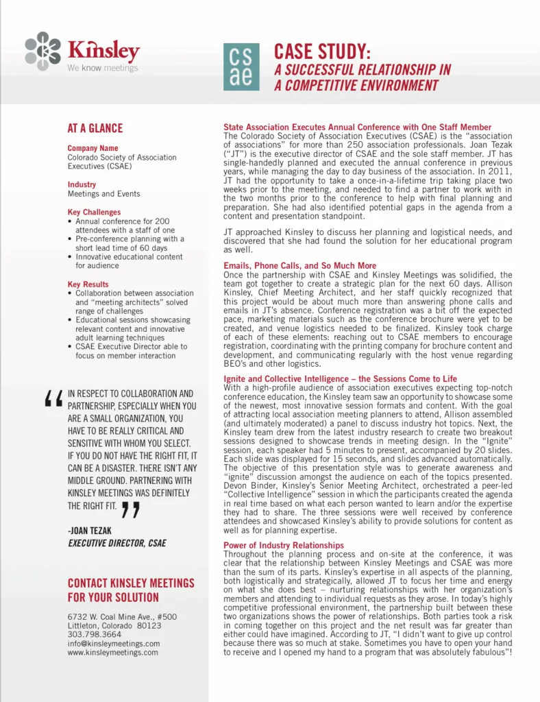 Kinsley had already built a strong reputation as a meeting and event planning firm in Littleton, Colorado Over 20 years in the business gave them deep expertise, but their brand no longer captured the energy and innovation behind their work. Cranium Agency was hired to reinvigorate Kinsley’s presence and help them reach new markets and stand out in a competitive market.